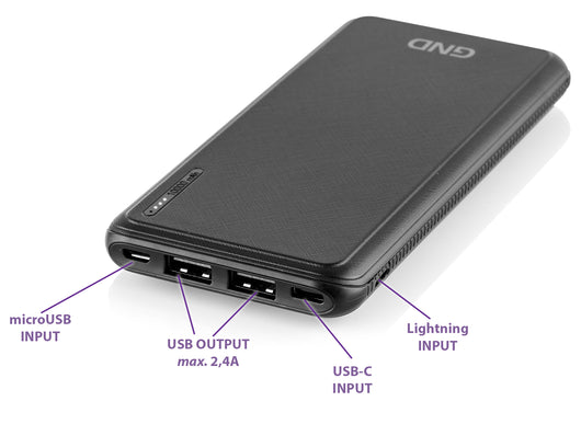 S rostoucím počtem mobilních elektronických zařízení a s jejich vývojem, roste také počet konektorů potřebných pro přenos elektrické energie. Tento trend ctí i powerbanka GNDPB100001B. Pro její nabití je tak možné použít jakýkoliv ze tří, dnes nejpoužívanějších, nabíjecích konektorů. A to microUSB, USB-C nebo Lightning konektor. Není tak potřeba nosit u sebe více dobíjecích kabelů. Jednoduše postačí ten, který používáte pro svůj mobilní telefon.
